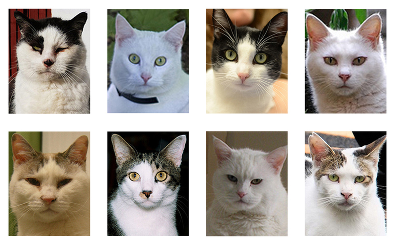 人間の顔を猫の顔として認識する「猫顔検出アルゴリズム」(OpenCV),人間の顔検出アルゴリズムによって人間の顔として認識された猫の顔(KITTYDAR)を左右に並べた作品です.