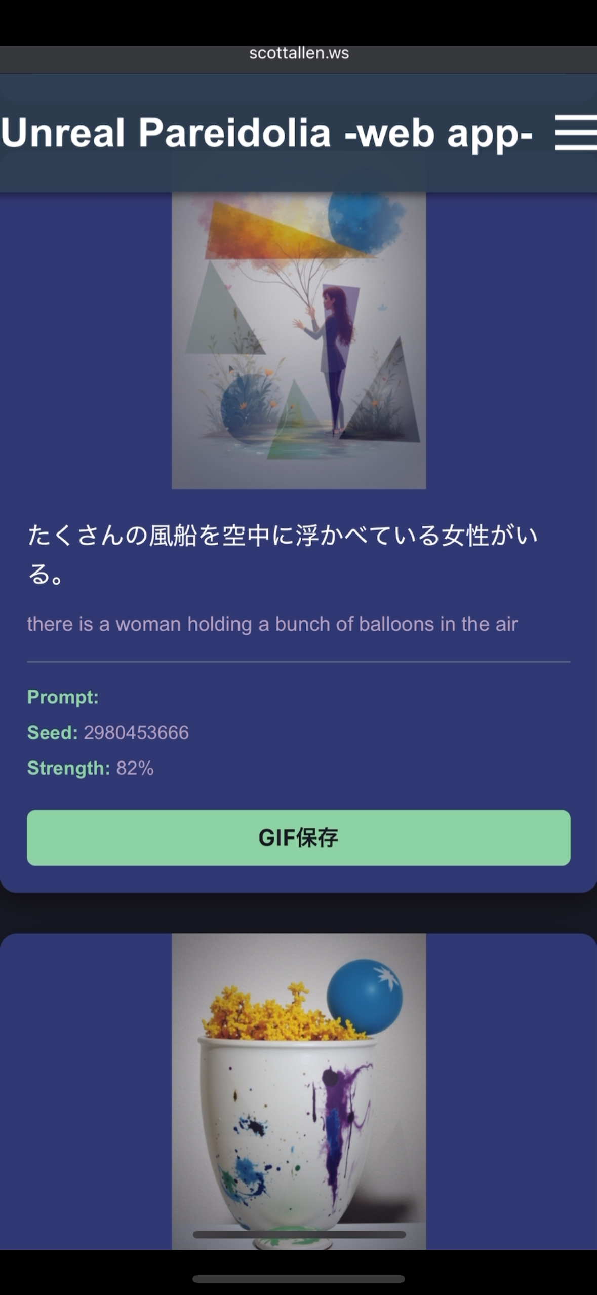 ファイル名の例: 男が海で立っている_sea_Seed12345678_Str80.gif,この場合キャプションが「男が海で立っている」,プロンプトが「sea」,Seed値が「12345678」,変換強度が「80」となります.
