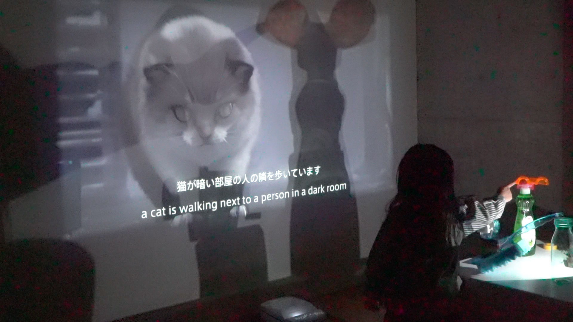 本作品は日用品や玩具などの影に対して,生成AIにおけるimg2imgを使用した画像とキャプションがリアルタイムに生成されます.体験者は影絵を作り,その後ボタンを押すことでAIの見立てを開始します.次に,そのキャプションが表示され,さらに生成された画像が影絵上にビデオプロジェクタでプロジェクションマッピングされ重ね合わされ,それぞれの対応関係を確認します.