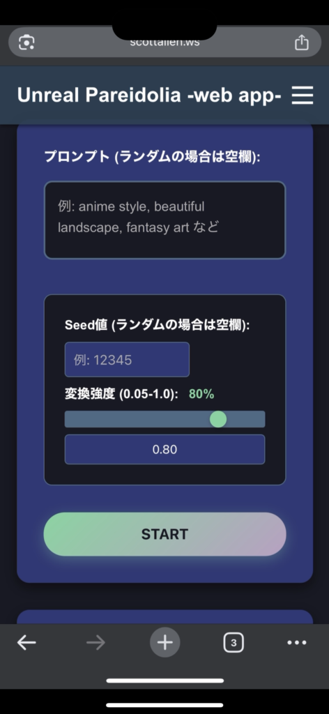 - プロンプト(想像を飛ばしたいのでなしでOK),Seed値(空欄でOK),変換強度(そのまますぎず,輪郭を継承しないほど離れてもいない値を探す)を調整してSTARTボタンを押す