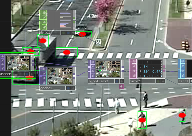 実際に座標を取得する場合はinfo DATかinfo CHOPを使用します.デモではinfo DATに検出したblobの情報を表示し,そのu,v(横,縦のポジション)をインスタンシングのパラメタに割り当てることでBlob Track TOPとは別に赤い円をblobの位置に描画しています.