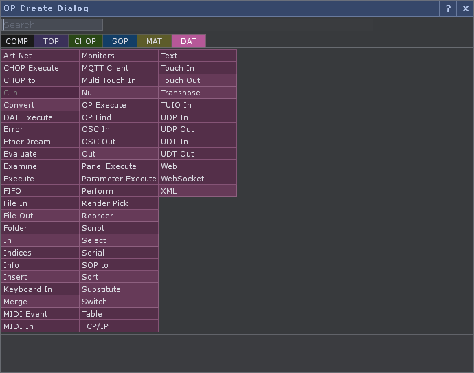 DATはDataの略で,データベースや外部デバイスとのデータのやりとりで使用するオペレータです.CHOPと重複する機能もありますが,scriptによってCHOPより詳細に設定可能だったります.