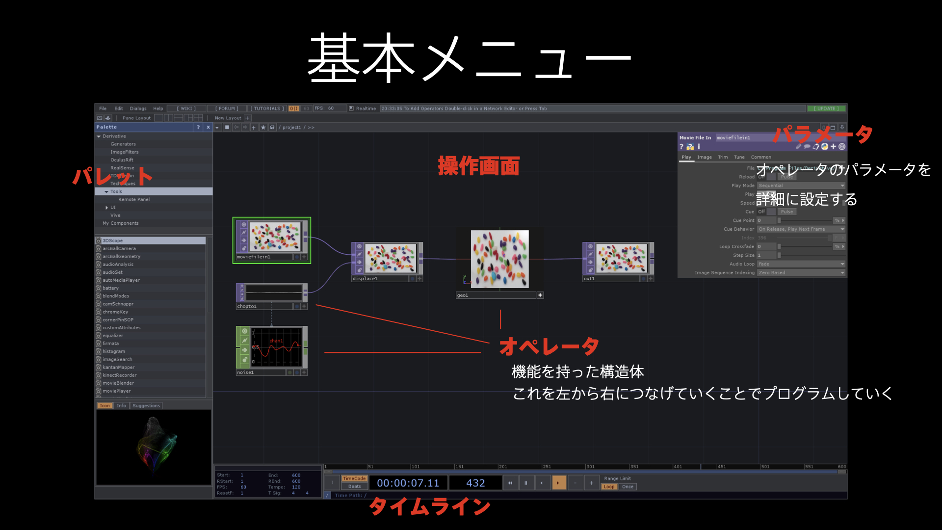 TouchDesignerは一般的なプログラミング環境と異なり,機能を持ったボックスを視覚的に繋げていく(パッチング)ことでプログラムを構築するビジュアルプログラミング環境です.