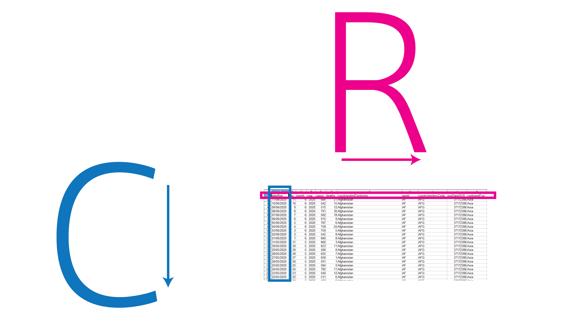 データを扱っていると,データを調整する必要が出ることが多々あります.その際TouchDesignerではRowとColumnという言葉頻出します.それそれが縦と横のどちらの要素を扱っているのかこんがらがってしまわないために以下の図の用に覚えるとわかりやすいでしょう.
