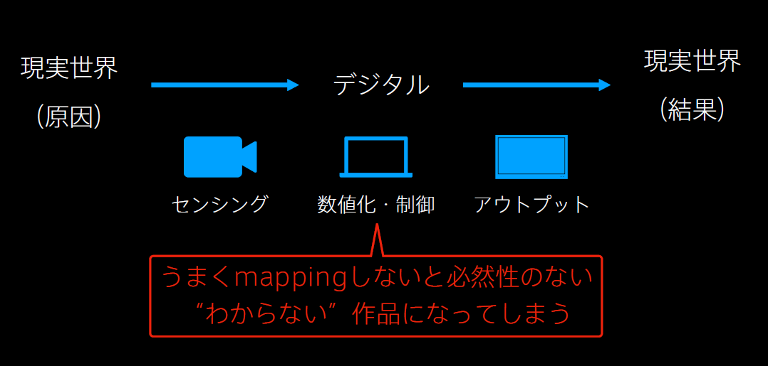 mapping問題とはどこかで聞いた言葉を使っているんですが,図のようにコンピュータのプロセスでうまくマッピングしないと必然性のない作品になってしまうリスクがあります.原因と結果を意図的に離す場合を除いて,基本的にはセンシングした入力が何らかの形で出力につながっているとわかることが非常に重要です.
