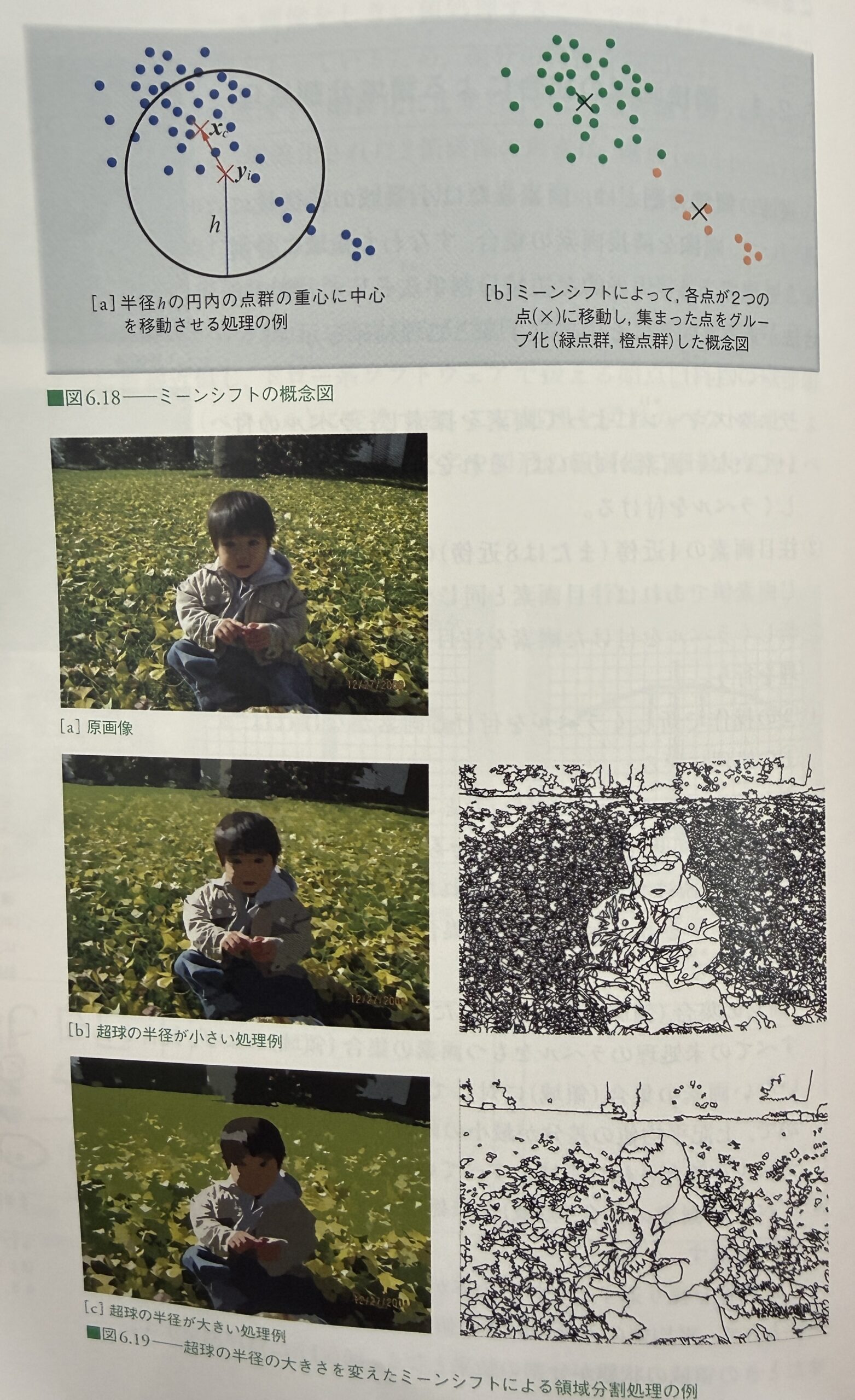 たとえば,カラー画像の画素を,位置パラメータ(x, y)+色パラメータ(R, G, B)の5次元の特徴空間にばらまかれた点群として扱います.そのなかで近い画素同士をミーンシフトで移動させます.
