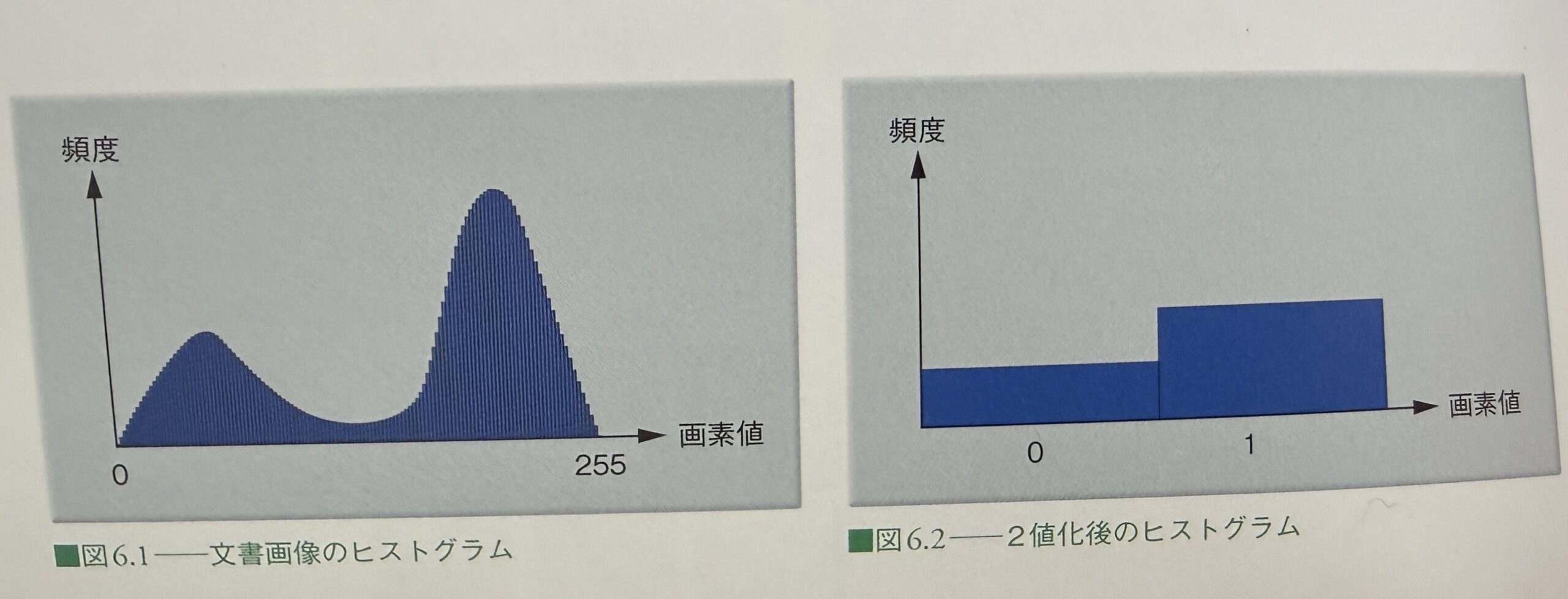 白い紙に黒い文字が印刷された文書は,人間には2色しかないという認知ですが,実際には特に境界付近で細かなグレースケールで構成されています.これに対してある値以上なのか,未満なのかで数値的にも0か1かの2値に無理やり分けるような処理を2値化といいます.