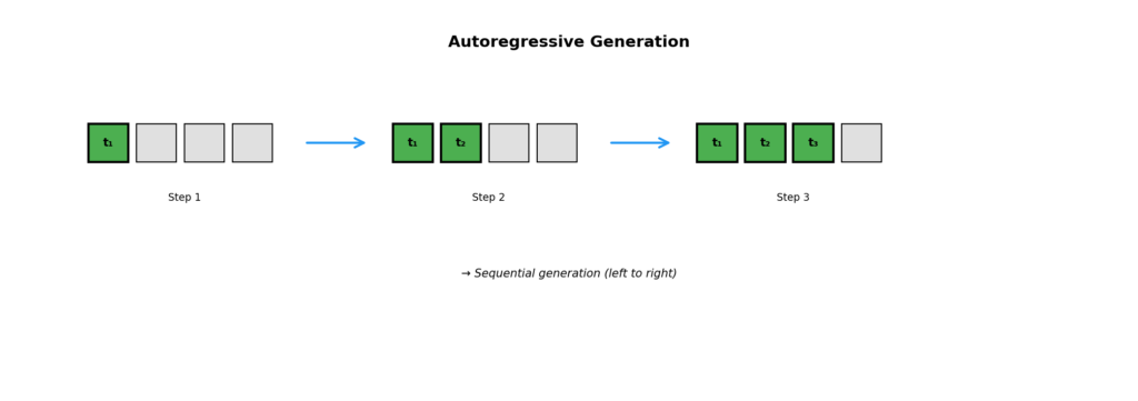 生成: P(t1) → P(t2|t1) → P(t3|t1,t2) → ...