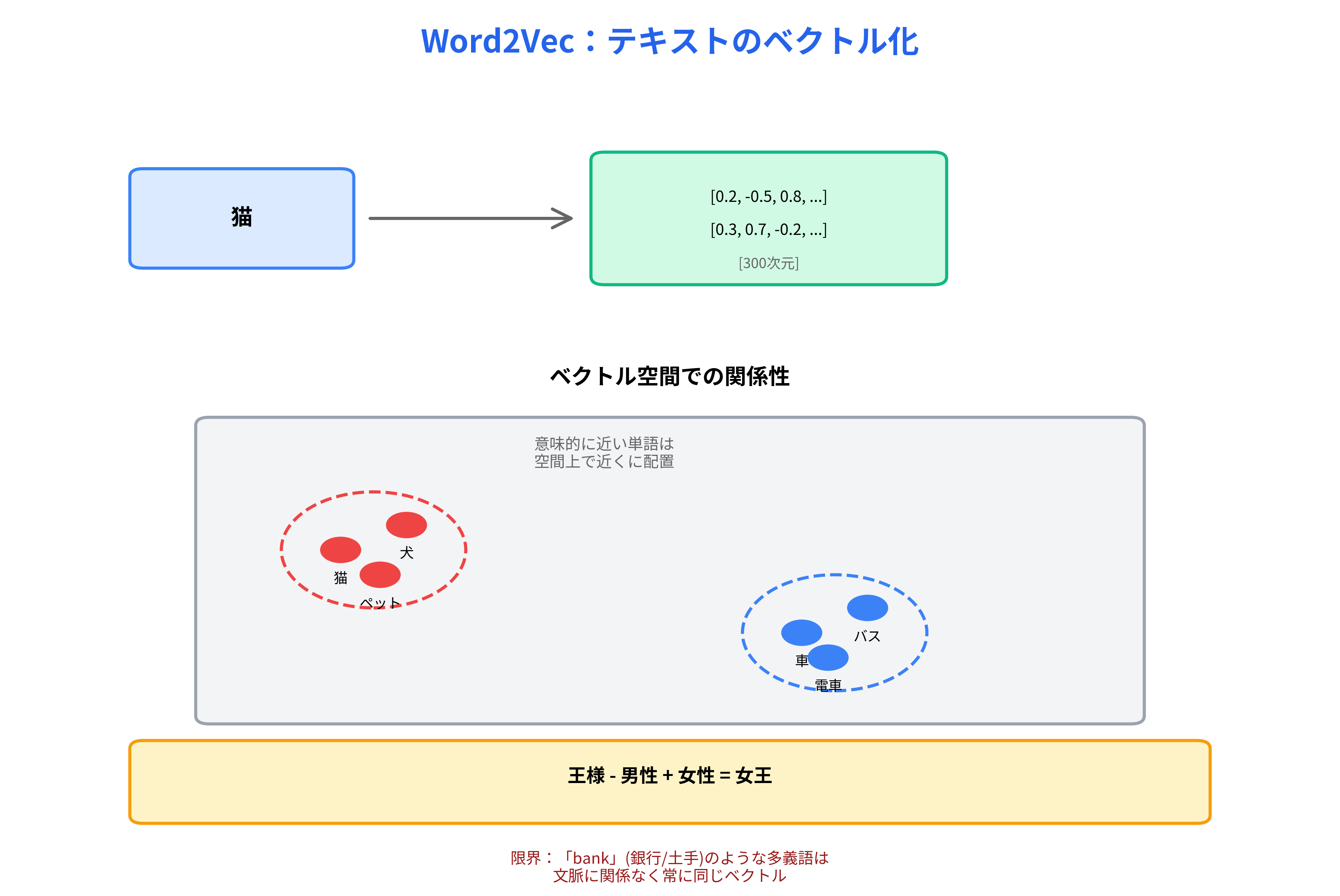 2013年,GoogleのTomas Mikolovらの研究チームが発表したWord2Vecは,テキスト処理に革命をもたらしました.Word2Vecは,大量のテキストから単語の意味を自動的に学習し,各単語を300次元程度のベクトルに変換します.