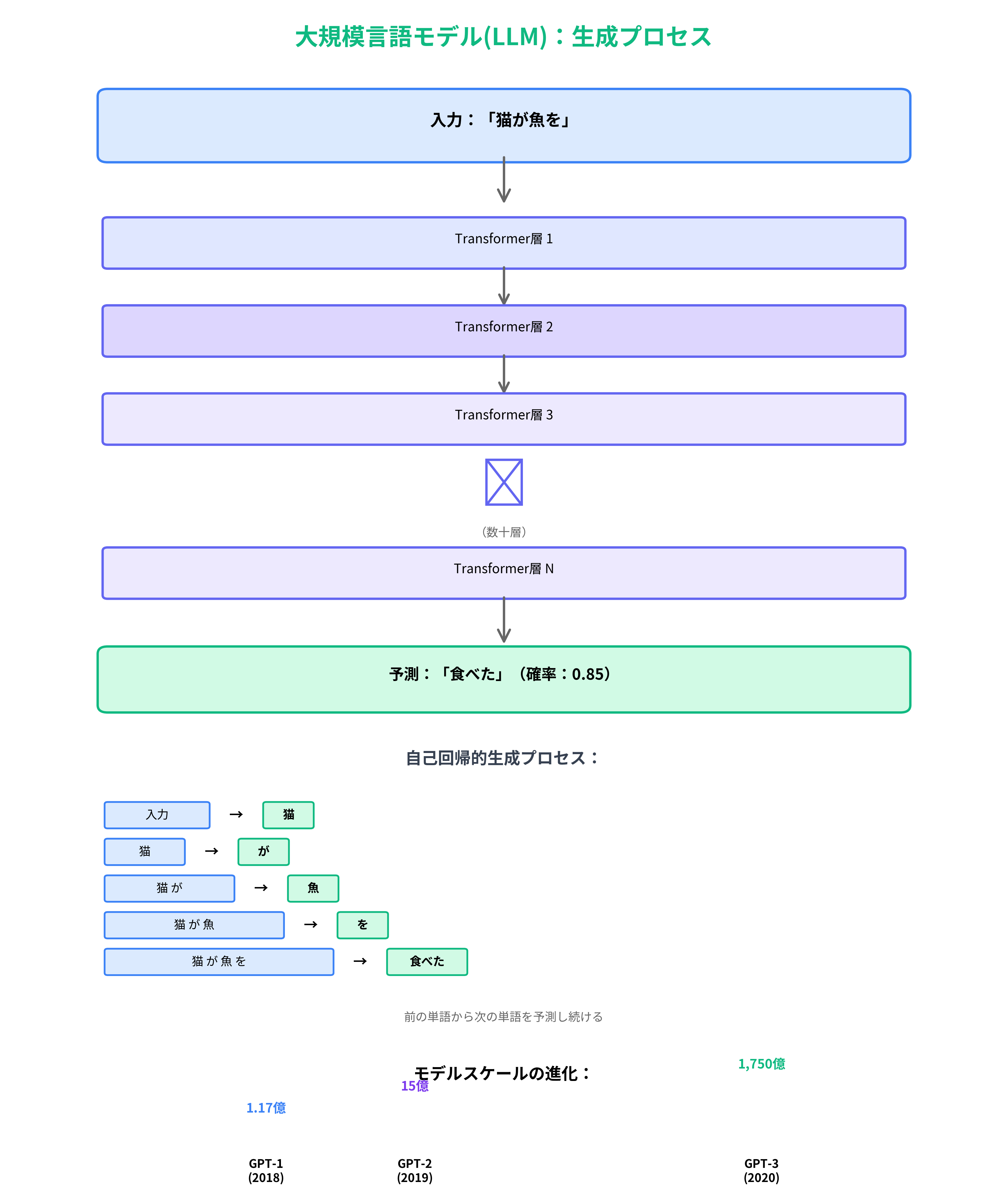 Transformerアーキテクチャの登場により,並列処理が可能になりました.BERTは双方向Transformerを使い,文脈の深い理解を実現しました.パラメータ数は3.4億(BERT-Large)に達しました.しかし,BERTの主な用途は,まだテキストの「理解」であり,自然な文章の「生成」ではありませんでした.