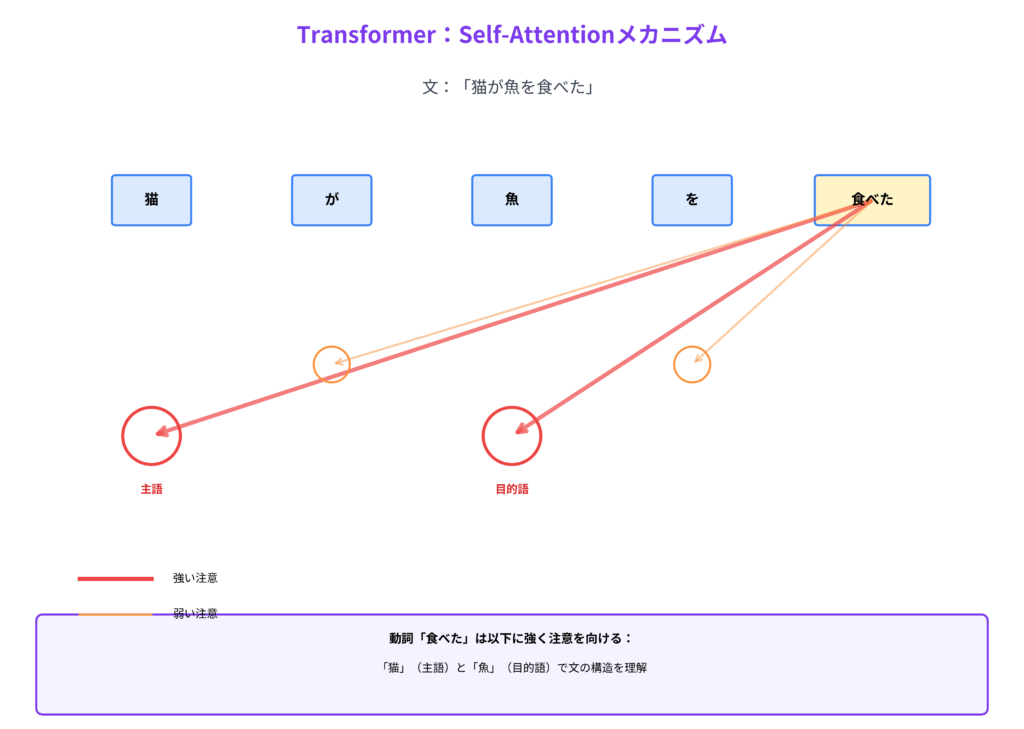 例えば,「猫が魚を食べた」という文を考えてみましょう.「食べた」という動詞は,誰が食べたのか(主語)と何を食べたのか(目的語)を理解する必要があります.Self-Attentionでは,「食べた」が「猫」(主語)と「魚」(目的語)に強く「注意」を向けることで,文全体の構造を理解します.