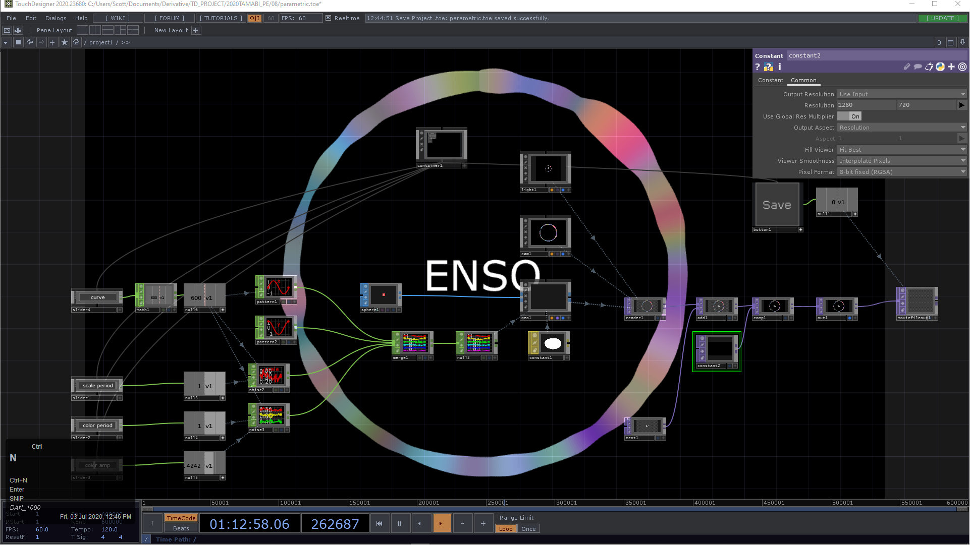 このように実は,私達はproject1というnameのContainer COMP内でネットワークを編集し,その結果をperform mode(F1キー)でperform1というnameのWindow COMPに表示していたのです.