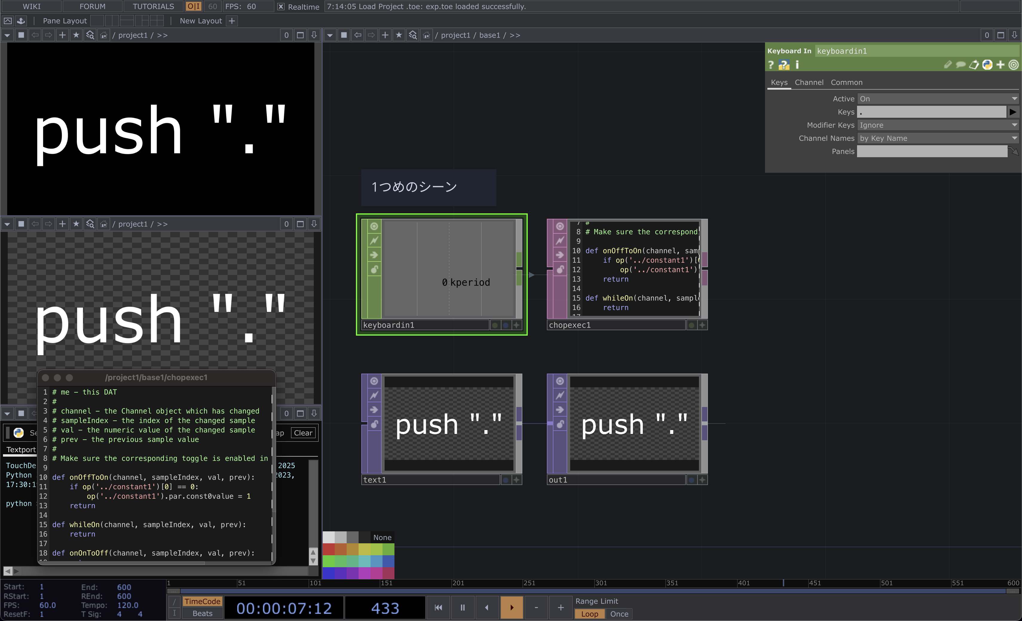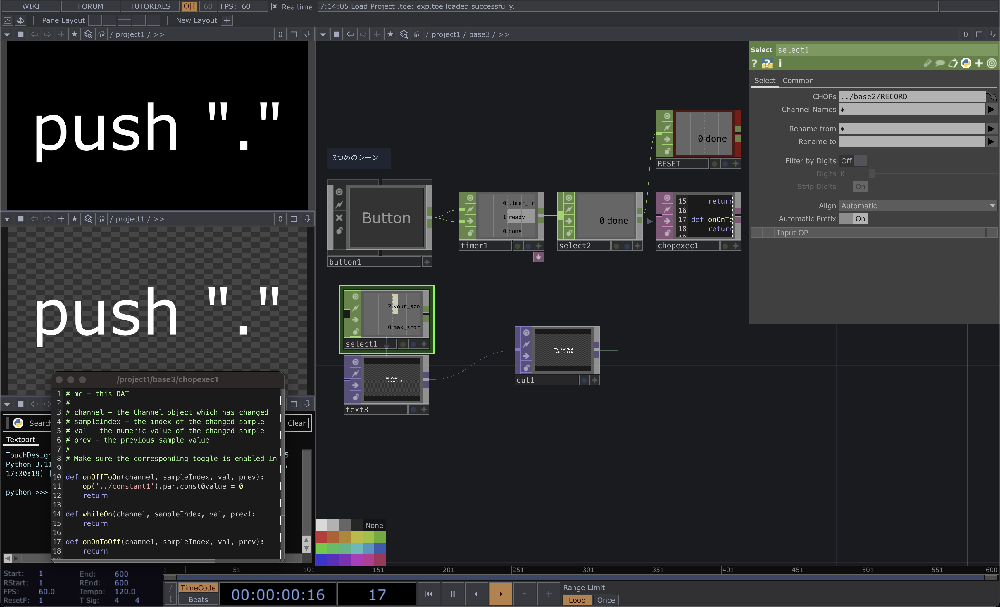 Timer CHOPは入力に対して指定の時間だけ計測します. タイマーのスタートは2つめのインプットであることに注意してください. 1つめのインプットは初期化です.初期化はタイマーのtimer_faction(0 – 1で表される割合)がゼロに戻り,readyが1,doneが0に戻ります. このtimer_fractionが指定時間で0 → 1になることを利用して,シーンを管理したりFade In/OUTなどをするのにも有効です.