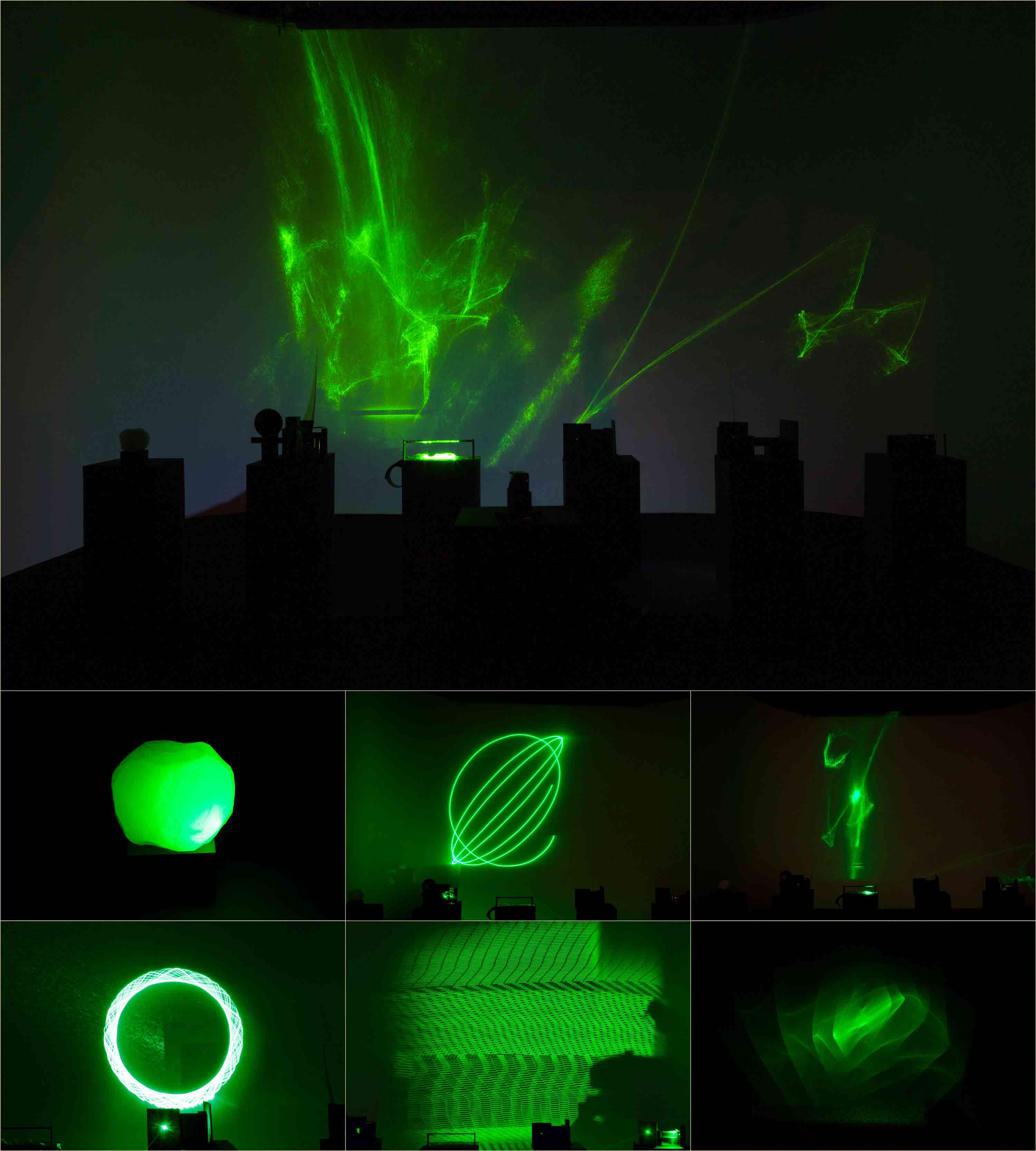 本作品では,単一レーザー光源のスポットがゆるやかに移動していき,ろう石やテープ,液体,バネやモーターなどを用いて制御した様々な表示機構を有するモジュールにより変調された像が壁に投影される.メディウムが固定化される以前の様々な可能性を体験することで,既存の固定化された映像やその他の概念の関係性を再構築する契機となることを目指した.