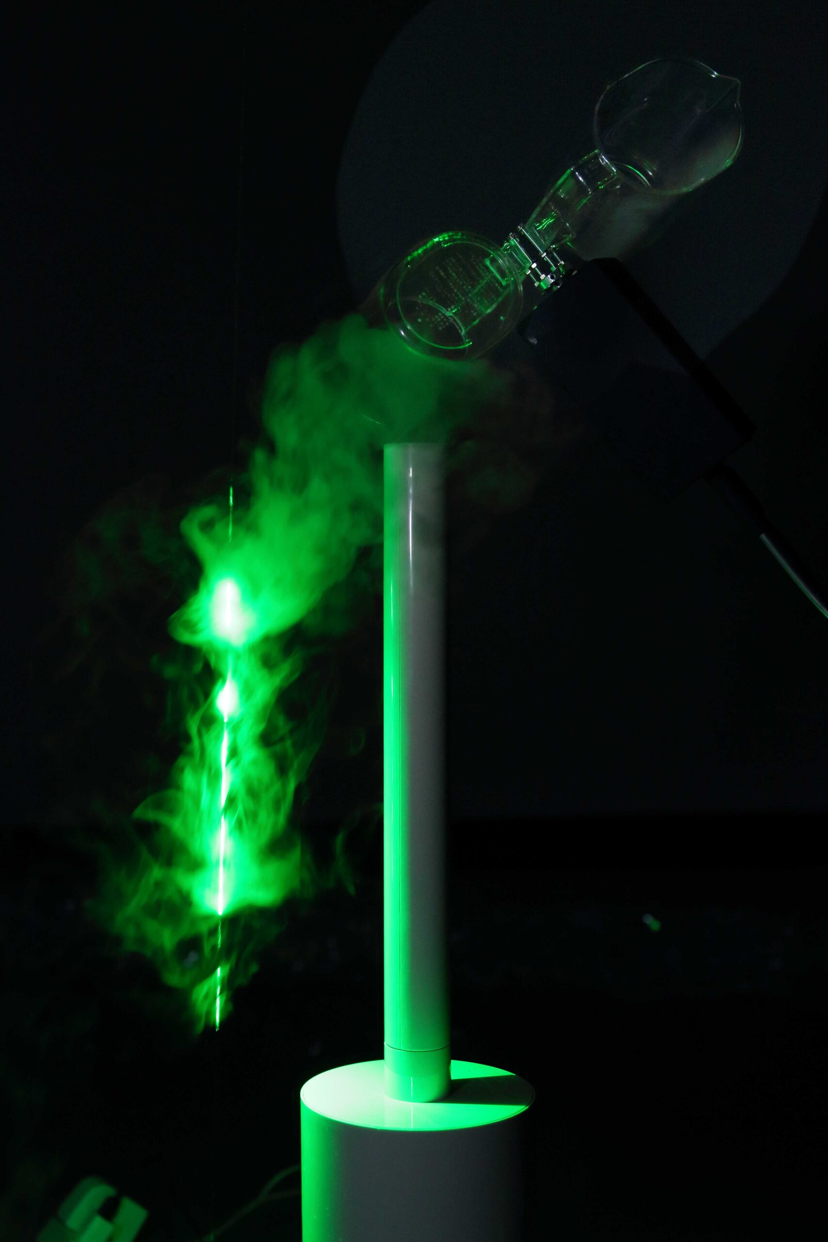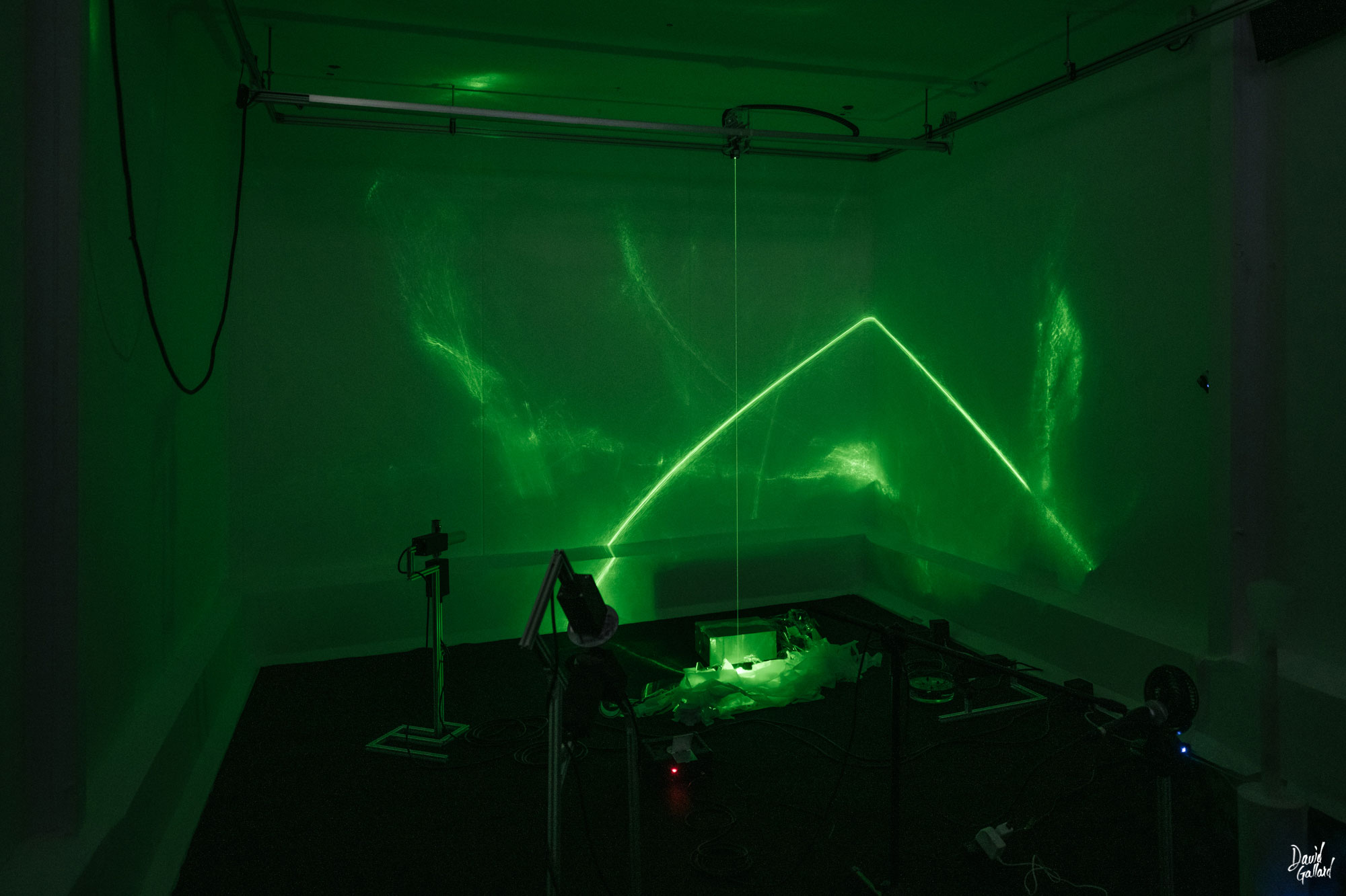 空間に点々と配置された様々な日用品は,天井に設置された横方向・奥行き方向に移動するレーザー光源に照らされることで,それぞれが持つ造形によって反射された光の像となり,壁面のあちらこちらに投影されていきます.