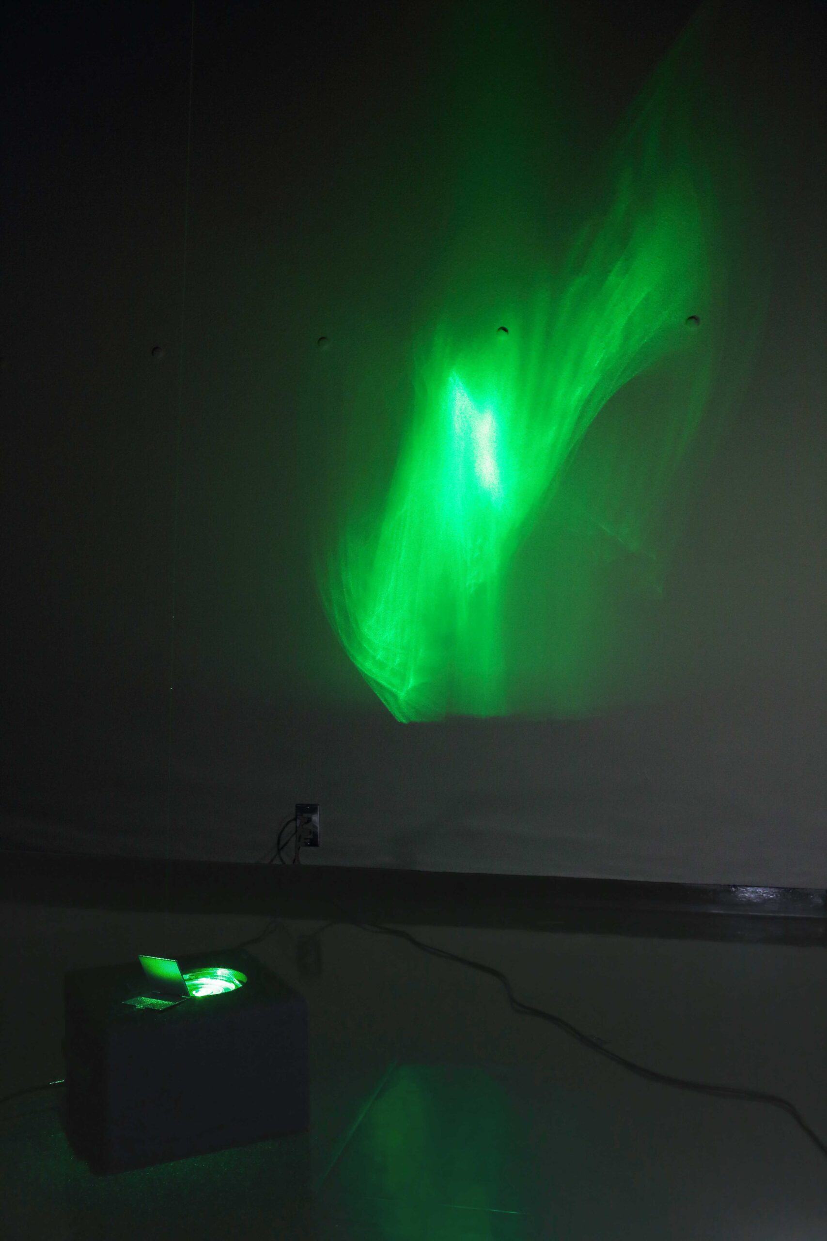 In this work, various commodities as projectors arranged in a space are illuminated by the laser light source moving in the lateral direction and depth direction installed on the ceiling, and the light reflected by their own moldings It becomes an image of and is projected on the wall. By looking at the image created by the sculpture, the viewer explores the relationship between the sculpture and the image, and the countless ghosts of the image hidden behind the sculpture.